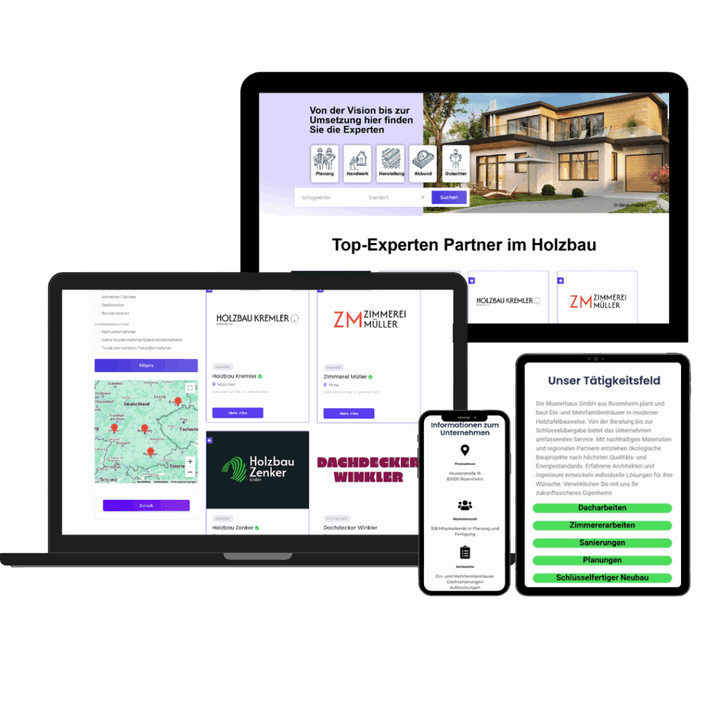 Unser Experten-Verzeichnis auf Holzbau-Experten.de ermöglicht Bauinteressenten, qualifizierte Experten im Holzbau zu finden – von Ausführenden über Planer bis hin zu weiteren Dienstleistern. Gleichzeitig bietet die Plattform Unternehmen die Chance, mit anderen Firmen in Kontakt zu treten, neue Produkte zu entdecken und so ihre eigene Qualität weiter zu steigern.